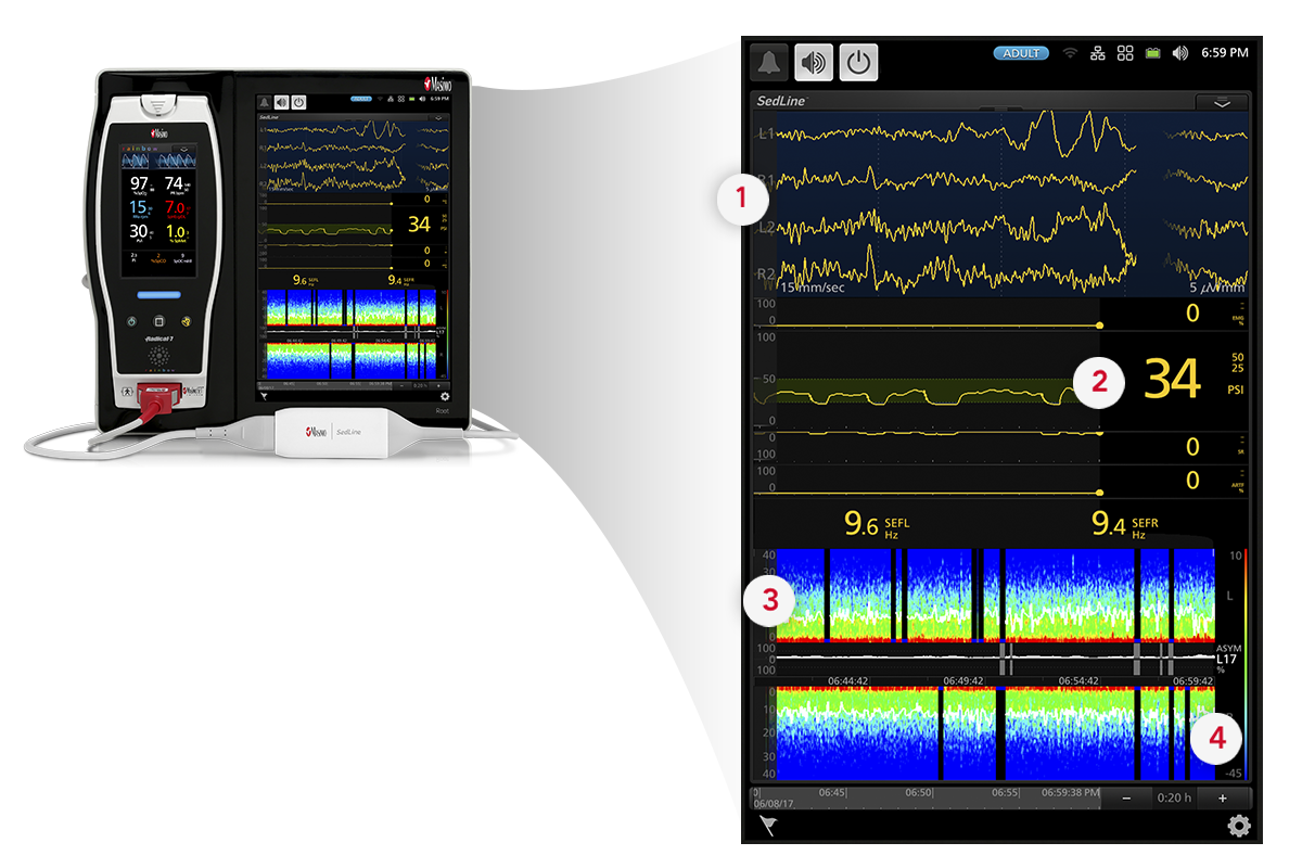 SedLine verbindet sich nahtlos mit der Root Patientenüberwachungs- und Konnektivitätsplattform – mit einem leicht verständlichen, individuell anpassbaren Display, das mehrere Ansichten der Gehirnüberwachungsdaten bietet und so die Sichtbarkeit im OP und auf der ITS verbessert.